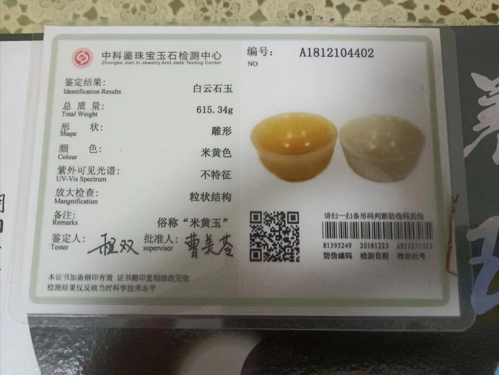 优质的白云玉在灰绿色的内里闪现出绚丽的"金线"或"金星"效果,适于制作成砚台、笔架等文房用具及其他工艺品,这对碗俗称米黄玉,米黄玉,又名松香黄,因其色如黄米而得名。其玉石质细腻柔润、色泽纯净剔透,故被人们称为“黄水晶、黄玛瑙、黄金玉”,具有非常润泽的油脂光泽和蜡状光泽。。